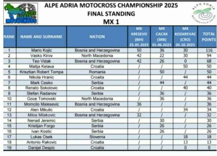 Гевгеличанецот Васко Киров, кој вози за Мото Клубот Вардар од Скопје, се искачи на високата вицешампионска позиција, освојувајќи го второто место во еден од најпрестижните мото шампионати “ Алпе Адриа Мотокрос Шампионат 2025 ”.