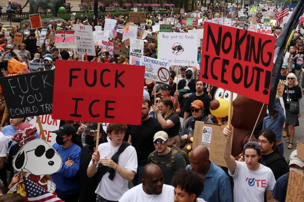 Најмалку 100.000 луѓе се собраа во Чикаго, многумина со транспаренти против федералните агенти за имиграција.