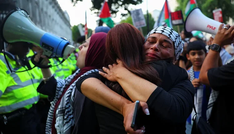 Стотици граѓани вчера се собраа пред канцеларијата на британскиот премиер на Даунинг стрит во Лондон, барајќи Велика Британија што поскоро да ја признае Палестина како независна држава.