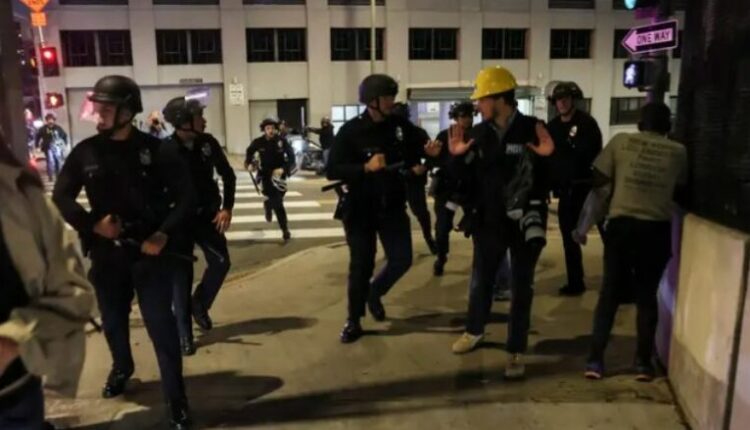 „Повеќе групи продолжуваат да се собираат на 1-ва улица помеѓу Спринг и Аламеда“ во рамките на назначената зона за полициски час во центарот на градот, напиша Полициската управа на Лос Анџелес (LAPD) во X доцна во вторникот.