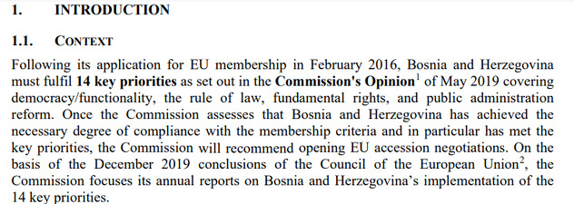 „По поднесувањето на апликацијата за членство во ЕУ во февруари 2016 година, Босна и Херцеговина мора да исполни 14 клучни приоритети како што е наведено во Мислењето на Комисијата од мај 2018 година. Откако Комисијата оцени дека Босна и Херцеговина го постигнала потребниот степен на усогласеност со критериумите за членство , Комисијата ќе препорача отворање на преговорите за пристапување во Европската унија“, изјавија тие.